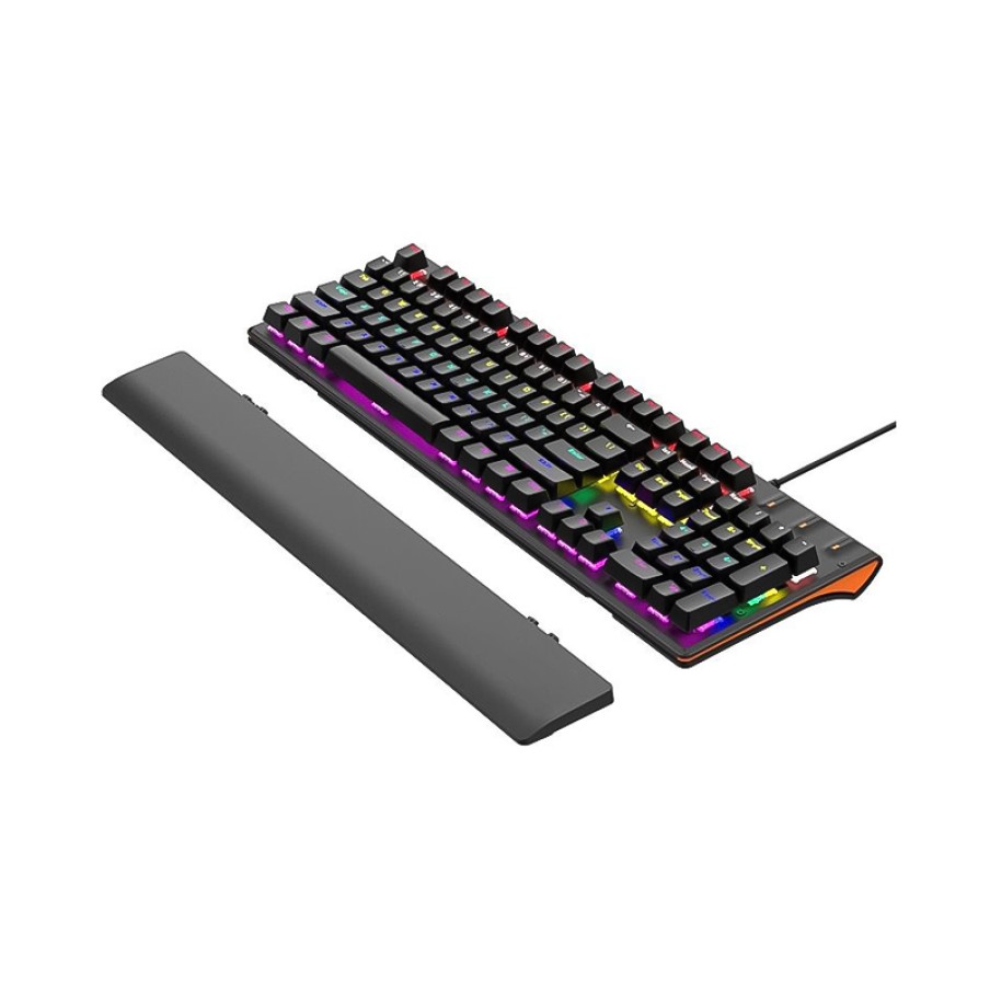This wired mechanical keyboard features a full-size 104-key layout with a complete function key area, meeting the diverse operational needs of both office work and gaming. Equipped with mechanical switches, it offers sensitive triggering and quick rebound, providing a clear and stable typing experience. The keyboard has 9 built-in backlight modes, allowing for free switching based on usage scenarios, creating an immersive user experience. It also comes with a detachable wrist rest, effectively supporting the wrist and reducing fatigue from prolonged typing, enhancing overall comfort and user experience.