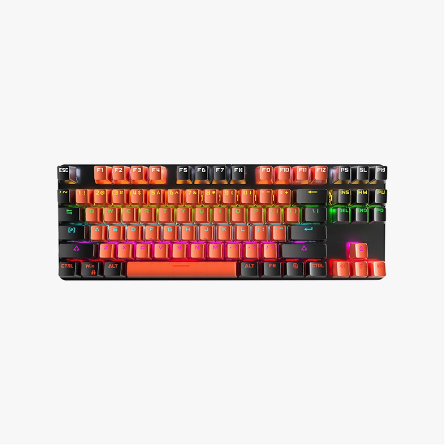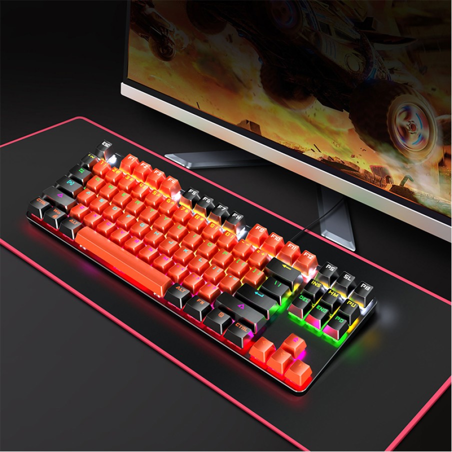 This wired keyboard features an ergonomic design that conforms to the natural curve of the hand, effectively reducing wrist and finger fatigue during prolonged typing or gaming, and improving typing comfort. The 87-key compact layout saves desktop space while retaining essential function keys, making it suitable for office work, studying, and entertainment. The keyboard features a waterproof design, effectively preventing damage from accidental liquid spills, enhancing safety and durability. It also includes a built-in RGB backlight system with multiple adjustable lighting modes, ensuring visibility in low-light environments and adding a touch of modern style and personalization to your desktop.