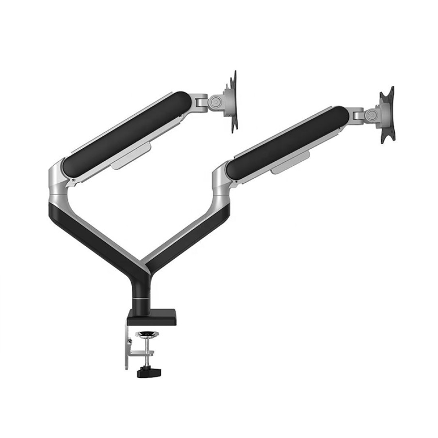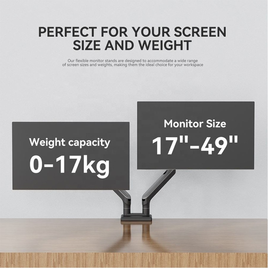 This dual monitor mount is designed for multi-screen work and enhanced productivity. It allows you to mount two monitors simultaneously, significantly improving desktop space utilization and work efficiency. Each arm supports multi-angle rotation and tilt, allowing users to freely adjust the monitor direction according to their needs. Whether in landscape, portrait, or any other angle combination, you can easily achieve the optimal viewing angle. The stand is sturdy and durable, while also incorporating ergonomic design to optimize neck and shoulder posture, reducing fatigue during long hours of work or design. The stand is reasonably designed, easy to assemble, and compatible with various monitor sizes, making it an ideal choice for office, multi-screen design, creative work, and home use.