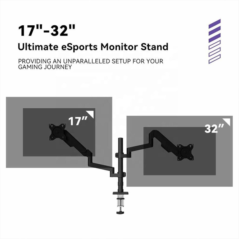 This dual monitor stand is designed for multi-screen office and creative work environments. Equipped with a gas spring support system, it allows for smooth and effortless height adjustment of the monitors. Each arm supports multi-angle rotation and tilting, allowing users to freely adjust the monitor orientation to achieve landscape, portrait, or any desired angle for the best viewing experience. The stand is sturdy and durable, compatible with most small to medium-sized monitors, and helps to keep your desk tidy. Combined with ergonomic design, it optimizes viewing angles and working posture, reducing neck and shoulder strain, ensuring comfort even during long hours of office work or creative design.